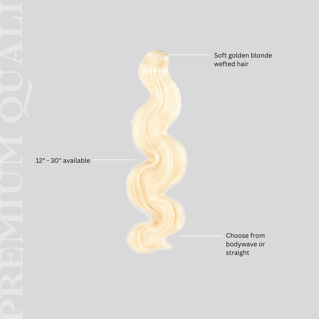 •Soft golden blonde Wefted hair